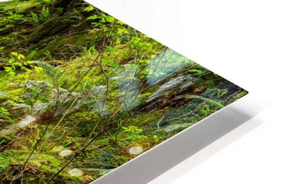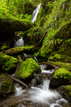 Merriman Falls with views of lush green moss covered boulders, ferns, and saturated logs, Quinault Rainforest, Olympic National Forest, Washington, USA.