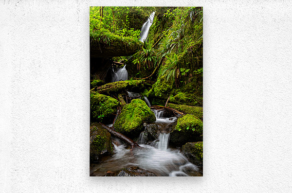 Merriman Falls with views of lush green moss covered boulders, ferns, and saturated logs, Quinault Rainforest, Olympic National Forest, Washington, US...[+]