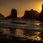 Bandon Beach at sunset with sea stacks, Bandon, Oregon, USA.